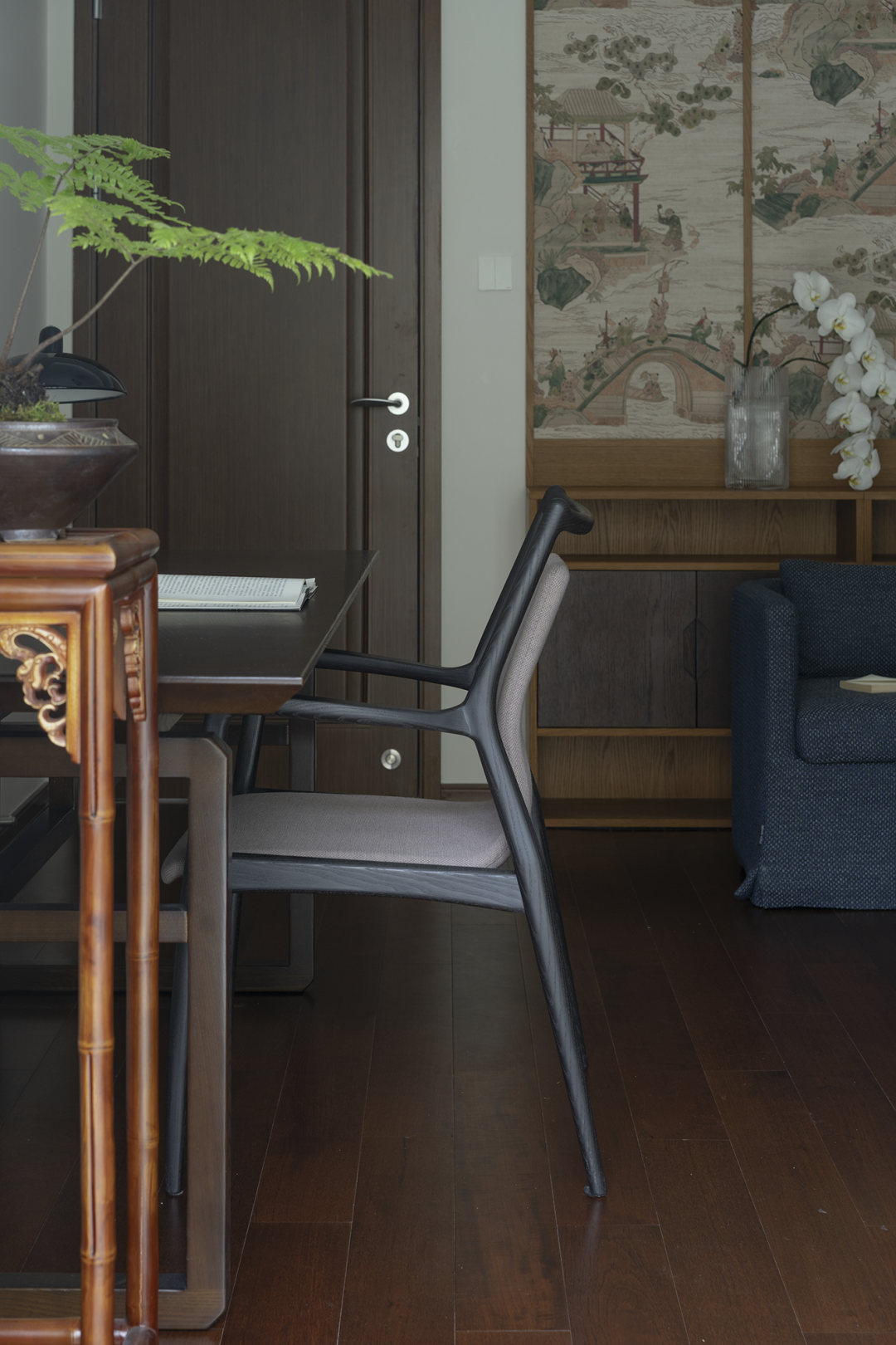 另一面墙边,是书桌,椅子是现代版设计的中式家具,旁边是和主卧床头柜一组的“明式摆台”。