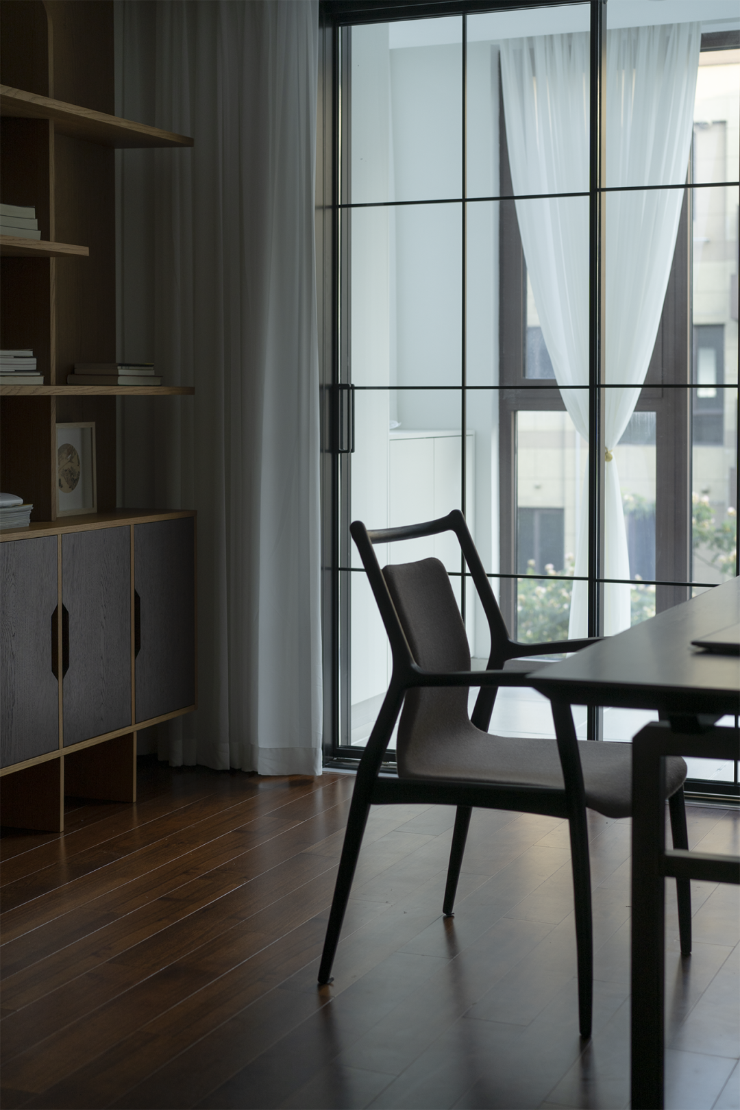 茶室与客餐厅之间,用白色窗帘隔开,形成一个“可开可合”的空间,文气的塑造大多在此。
